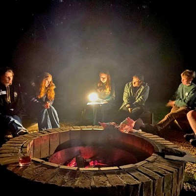 Following a lovely meal, we launched into our Open Mic session. The group assembled around the campfire, and Emily, Andrew, Stephen Moss and Roger Morgan-Grenville all gave readings, along with many of the attendees. This was one of the highlights of the weekend. A special mention goes to attendee Finn who recited The Trees by Phillip Larkin from memory!