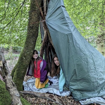 Day two saw the group clearing growth of invasive rhododendrons before building natural shelters from the branches. Next they learned how to make cordage from nettles and rushes followed by a short scavenge through the woods to collect material for making mobiles. After dinner they learned how to make bannock bread, baking it on an open fire they built in the woods.