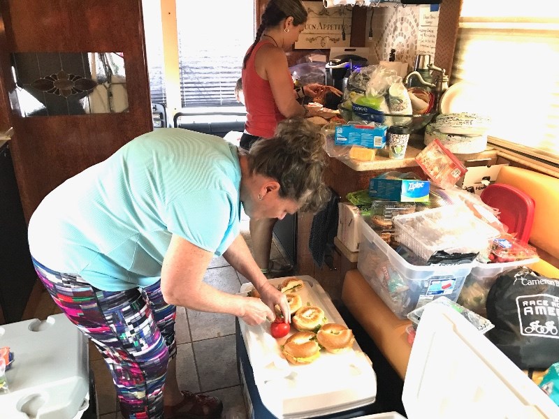 Bonnie Peake and Alessandra Suozzi preparing food for the shuttle cooler in Bloomington, Indiana.