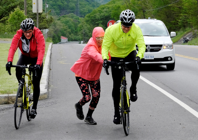 We used the RAAM route, riding over some of the toughest stretches of the race course. While the mountains of West Virginia are not as high as the Rockies, they are very steep and the vertical adds up as one climb follows the other. The weekend was a great opportunity for riders and crew to come together. We spent many hours practicing the skills we will need for the race, both during the day and at night. The most important of these is to have safe and swift rider exchanges.