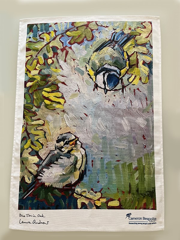 Organic Cotton tea towel, Blue Tits in Oak by fabulous artist Laura Andrew.