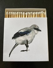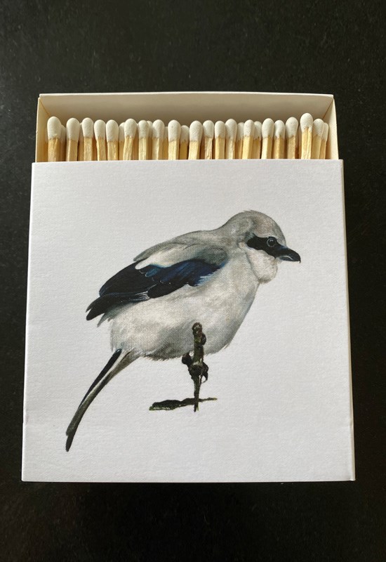 A beautiful box of matches with the Great Grey Shrike, painted by Lucy Neish. Made from 100% recycled card stock and wrapped with a cornstarch compostable protective wrapper.