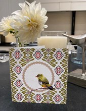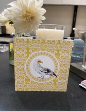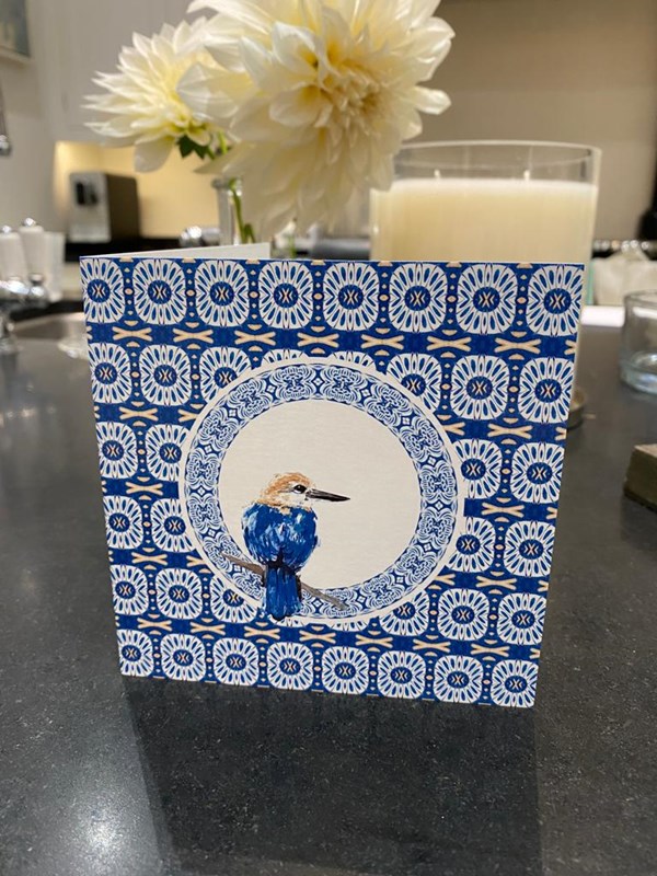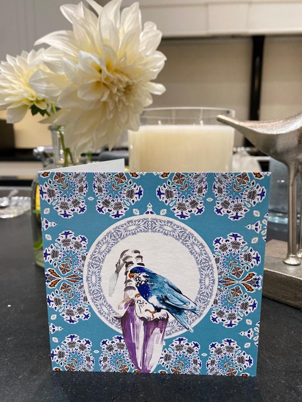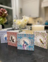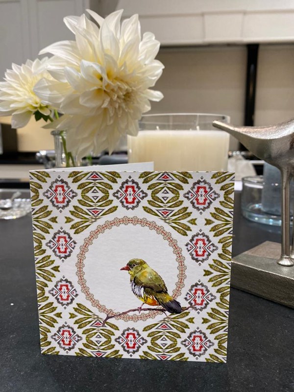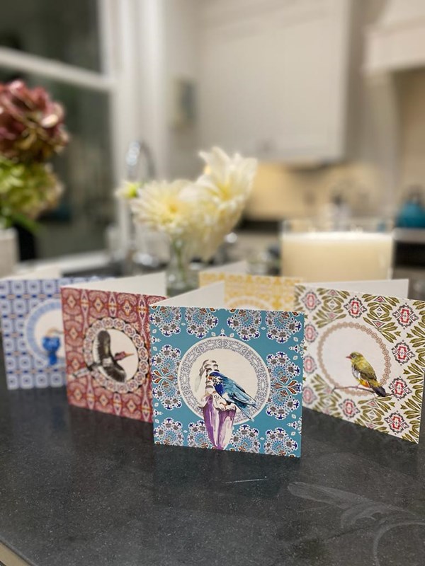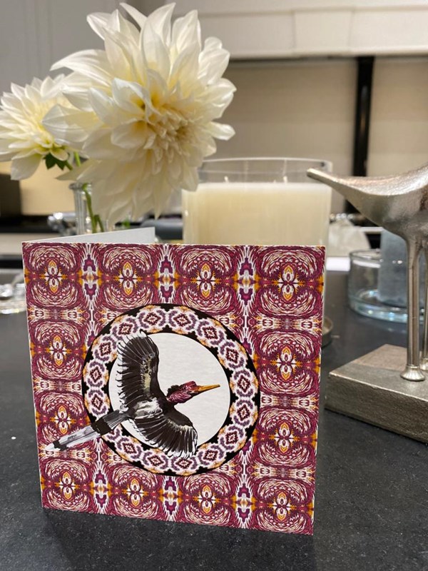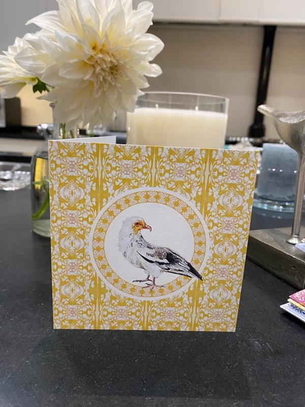 Left blank inside for your personal message. Designed by Anjali at Ipakshi Ltd. Each design is based on one bird under threat of extinction. Birds include Tuamotu Kingfisher, Egyptian Vulture, Helmeted Hornbill, Ultramarine Lorikeet and Green Avadavat.